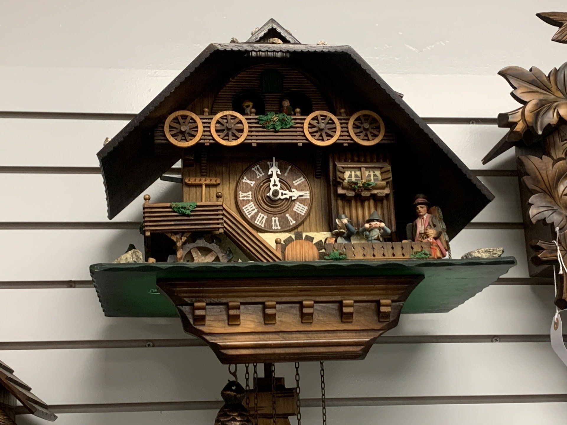 This is a Beautiful 8 day Chalet cuckoo clock very large 17"x17"x10' with a lots of animation including dancer, cuckoo bird, and a water wheel and more...