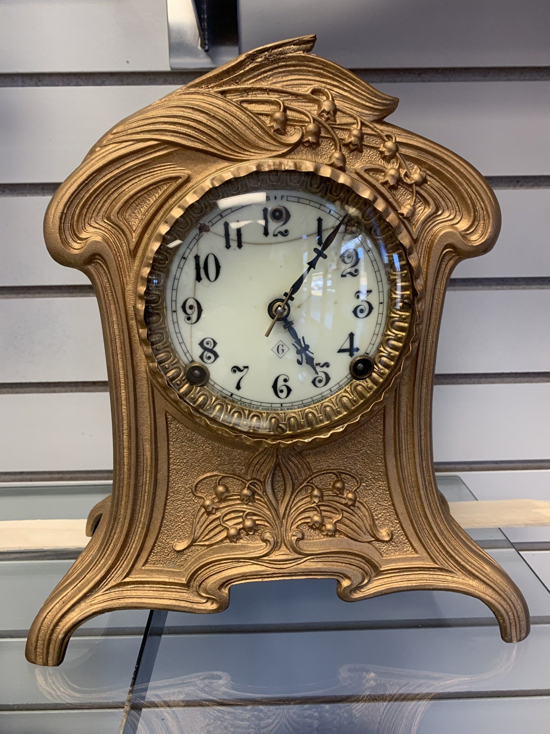 This is a beautiful Gilbert, Gold gilded mantle clock from 1909.