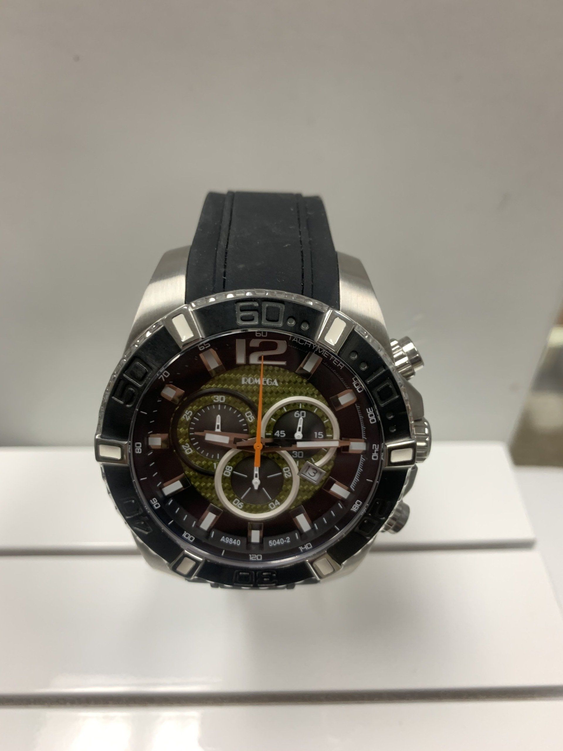 ROMEGA, Mens wrist watch, Chronograph, Quatrz, Rubber strap, W.R. 330 ft, Style # A9840.
